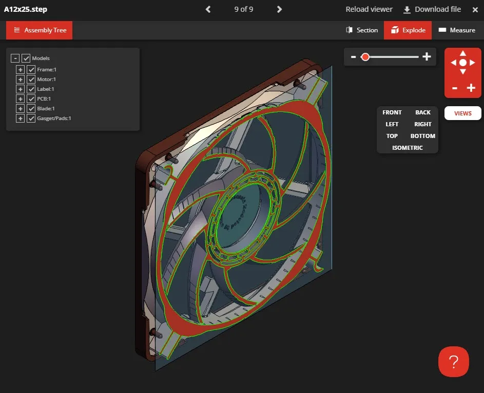 GrabCAD looks very different from our first example, with a dramatic black-and-red color scheme. Users can see a highlight effect when they hover over a face, and the section face highlights part edges in a vibrant green. GrabCAD offers a simple, easy-to-use interface with all the capabilities you would expect from a visualization tool — users can save views, measure, manage assemblies, and more.